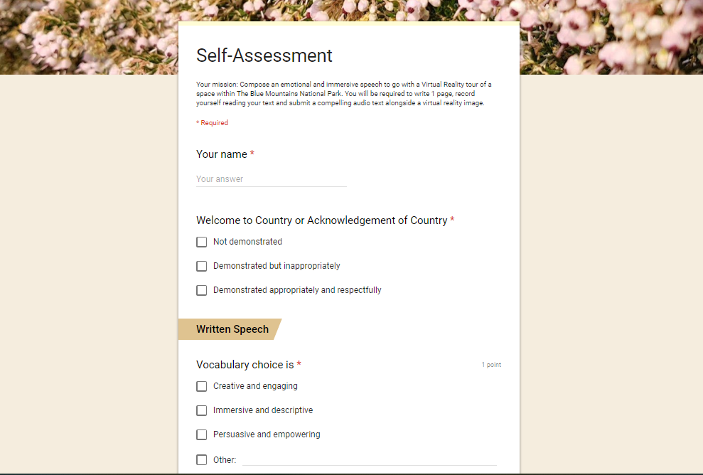 Click here to reach the Self-Assessment Google form. Email yourself a copy of your form. Use this for self-reflection and guidance as to how you can improve your text and audio recording.